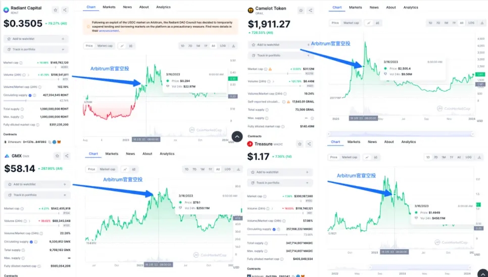 类比Arbitrum空投发放之前,Arbitrum Summer的盛况,从2023年1月到3月: Camelot(GRAIL)从200美金涨到4000美金,MAGIC从0.5美金涨到2美金,RDNT从0.04美金涨到0.45美金……