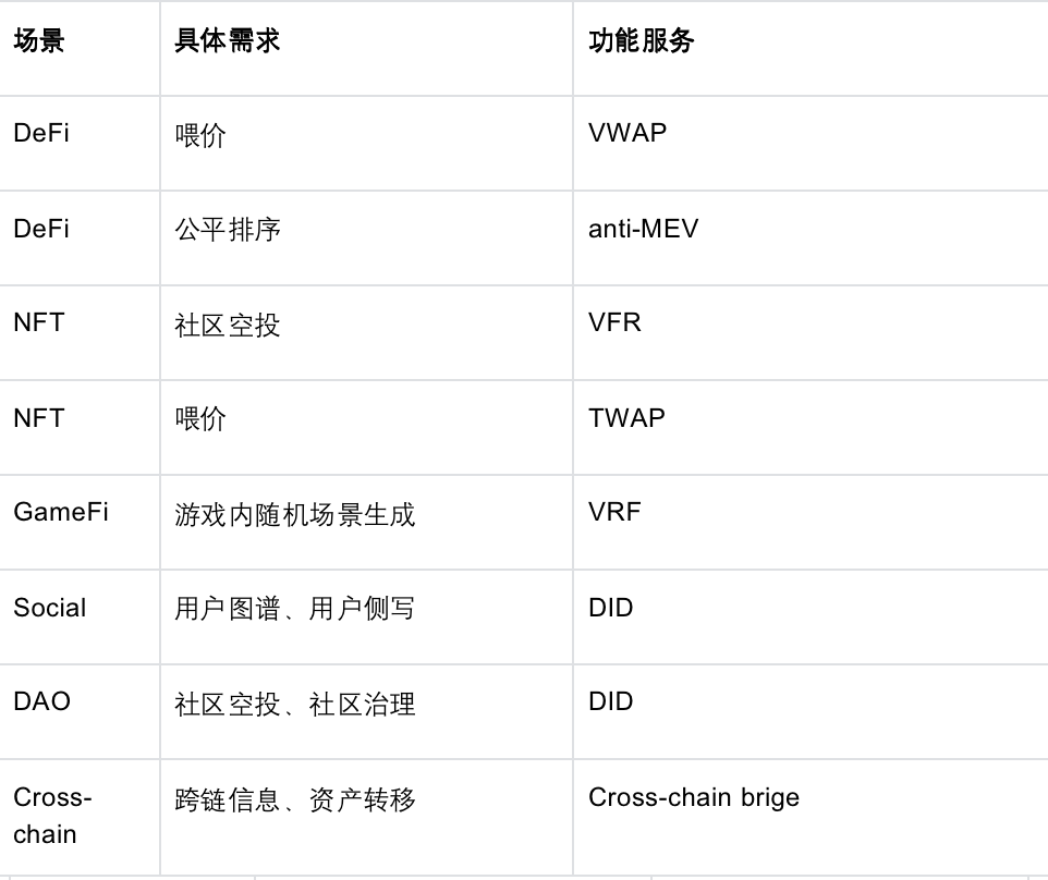 2021年Chainlink2.0 的白皮书首次引入DON(去中心化预言机网络)的概念。DON 是由一组 Chainlink 节点维护的网络,可以允许Chainlink 通过无需信任的链下计算向区块链提供外部数据。为了达成愿景,Chainlink 推出了 VRF、Keepers、CCIP 等一系列产品和服务,从而进一步打开了预言机在 web3 应用场景。在下图中我们分别列出了预言机在DeFi、NFT、GameFi、Social、DAO、跨链等几个不同场景的应用案例以供参考:
