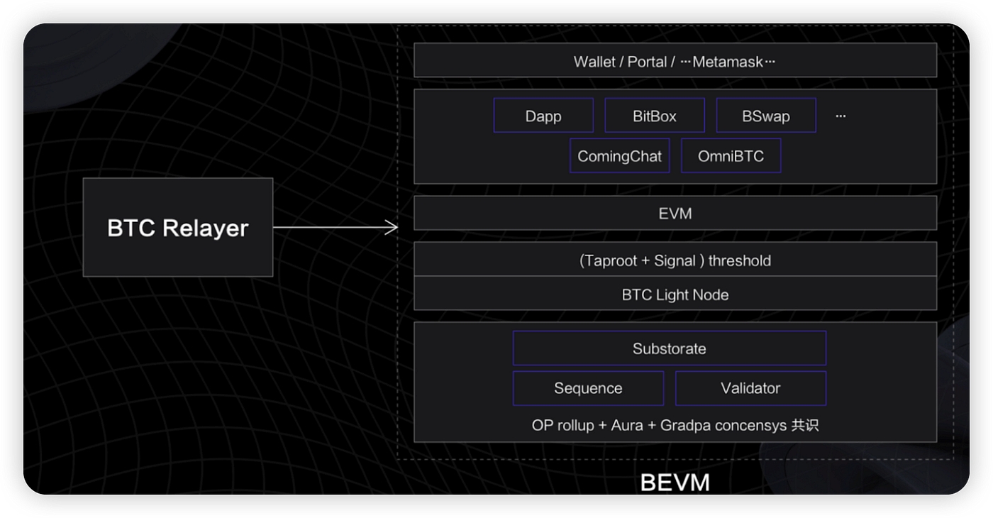 BEVM的设计理念是:在不改变比特币原有技术框架的情况下,直接取用比特币原生技术来实现去中心化的BTC Layer2。具体方式是Musig2聚合多签技术+比特币轻节点,实现BTC去中心化跨链到BTC Layer2,由于Layer2完全兼容EVM,因此,可以轻松地让BTC实现各类去中心化应用。