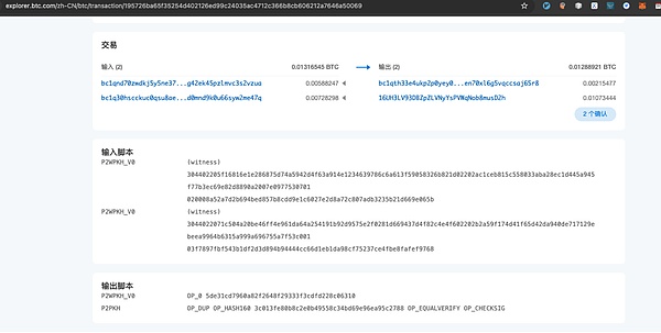 我们可以看到两个输入地址在转移BTC的同时,需要在输入的脚本中做验证,证明这两个输入地址可以花费这两笔输入(也就是上一笔的未花费输出,UTXO),而输出脚本,则规定了花费两笔输出比特币的条件,也就是在下一次将这笔未花费的输出作为输入时,应满足什么条件(一般普通转账,条件就是输出地址的签名,例如上图,P2wPKH表示需要taproot地址的签名验证,P2PKH则表示需要legacy 地址私钥的签名)。
