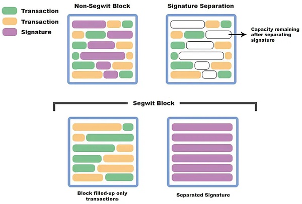 在比特币交易中,每笔交易的信息主要分为两个部分:基础交易数据和见证数据。基础交易数据包括了诸如账户资金结余等关键财务信息,而见证数据则用于验证用户的身份。对用户来说,他们主要关心的是与资产直接相关的信息,如账户资金结余,而身份验证的细节并不需要在交易中占用太多资源。换句话说,接收资产的一方主要关注的是资产是否可用,而不必过分关注发送方的详细信息。