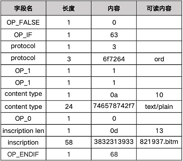 我们对witness字段从0063(OP_FALSE OP_IF)开始的编码进行分析,可以了解序列化的编码内容: