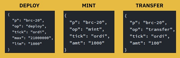 图 2:BRC-20 代币可能的三个初始操作(p = 协议名称,op = 操作,tick = 股票代码 / 标识符,max = 最大供应量,lim = 铸造限制,amt = 数量)