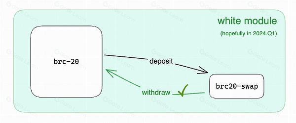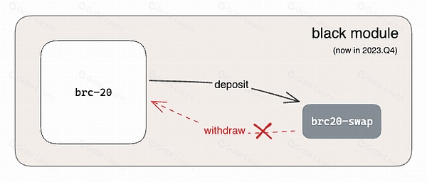 目前,brc20 swap采用黑模块的扩展模式运行,黑模块是出于安全考虑,在未经共识和验证的情况下,通过模块中的资金总和来确定用户可以提取的资金,也就是任何用户不能提取超过锁入模块资产总和的资产。