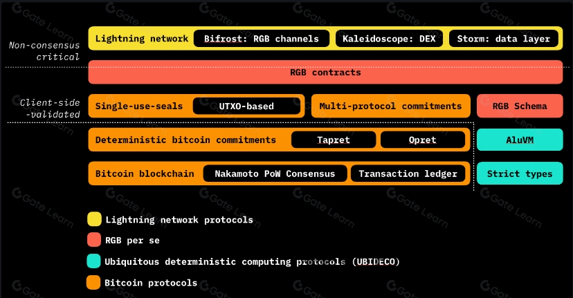 在其之上构建的是非共识关键层。该层包括一次次使用的密封,为RGB项目提供了额外的安全层,多协议承诺以及为客户端验证定义验证规则、状态类型和逻辑类型的RGB模式。