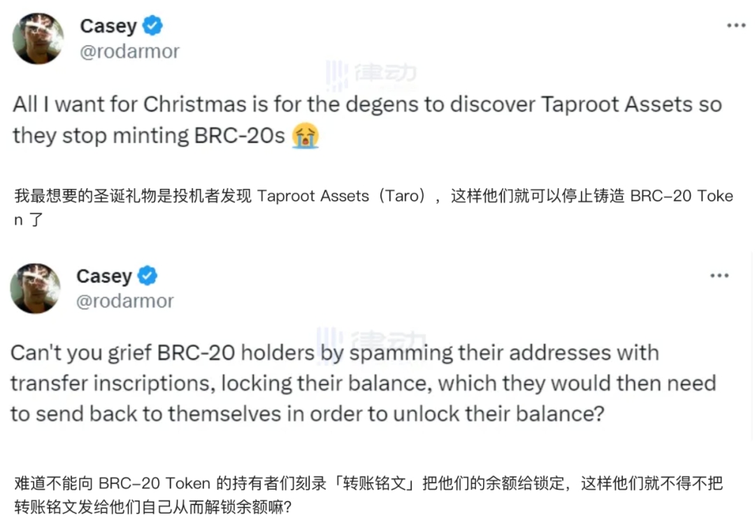 Casey 对 BRC -20 的不满已经很久了,尤其是他最近引起轩然大波的两条推文,更能感受到他对于 BRC -20 的消极态度: