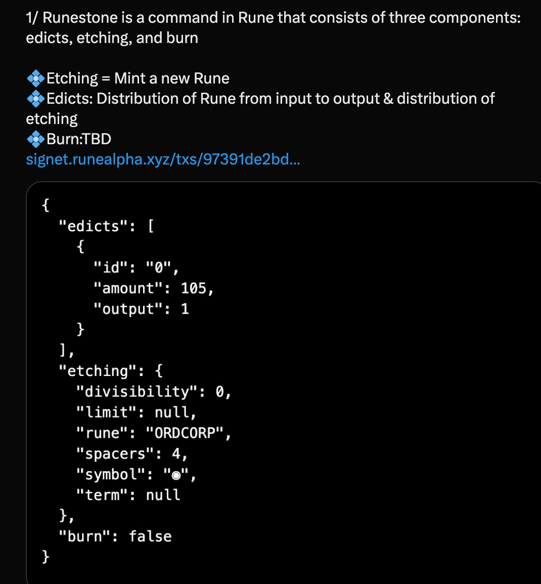如果协议消息后还有第二个数据输出,该交易则为一笔「符文」 Token 创建交易。这部分的数据输出将被解码为「 SYMBOL 」和「 DECIMALS 」两个整数,如果还有更多其它整数则无效。
