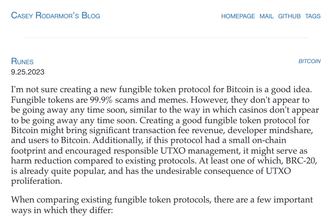 所以 Casey 决定为比特币构建一种“更好的同质化代币协议”,随后在 2023 年 9 月 25 日,他发布了 Runes 协议的初步构想。