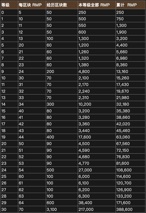 下方表格中,我根据官方提供的每个等级下单个区块能获得 RMP 数量。