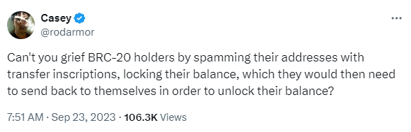 抵御投毒交易攻击:BRC20 可能会遭受到投毒交易(攻击者通过向受害者地址发送大量小额 BRC20 转账铭文,可能导致接收者的余额被“锁定”)攻击, Runes 则不会存在这个风险。